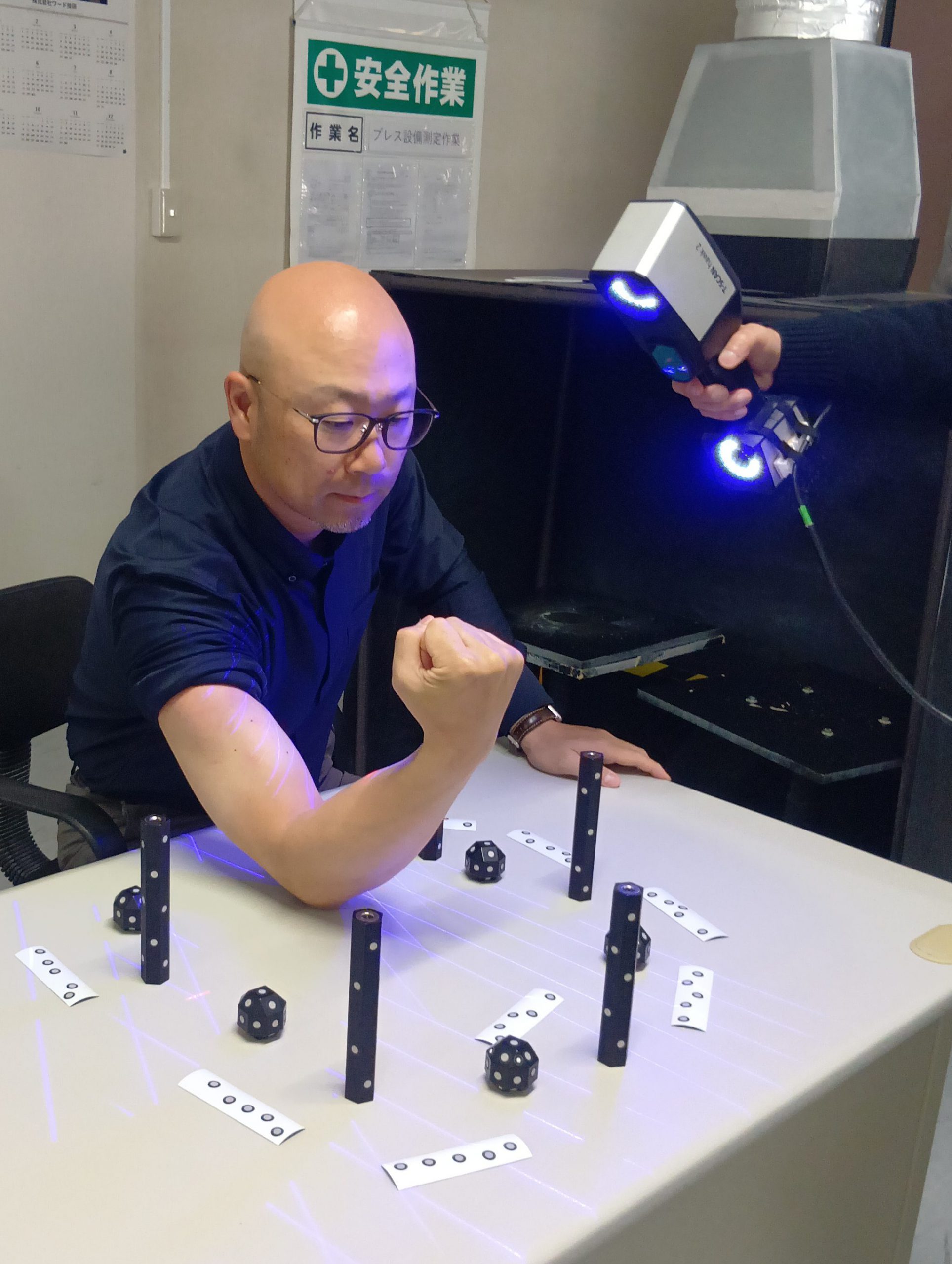 まずは、社長の腕をレーザー式非接触3Dスキャナーにてスキャンします。