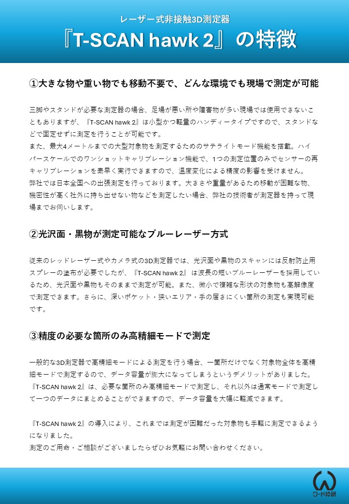 2026.01.16 レーザー式非接触3D測定器『T-SCAN hawk 2』の導入 ワード技研では、お客様からのご要望により確実にお応えできるよう、昨年よりハンディータイプのレーザー式非接触3D測定器『T-SCAN hawk 2』を導入しております。 『T-SCAN hawk 2』は、光沢面や黒物、狭いエリアから動かせない物など、これまでは測定が困難だった対象物も手軽に測定することが可能です。 測定のご用命・ご相談がございましたらぜひお気軽にお問い合わせください。 ↑ 画像をクリックして拡大